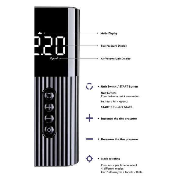 Has 4 unit values(PSI, KPA, BAR, kg / cm²) and 4 modes(car, motorcycle, bicycle, ball)